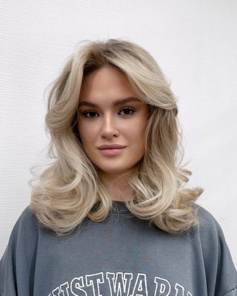 This voluminous, medium-length style channels classic salon glamour with a modern twist. The rounded blowout shape is balanced by strategically placed layers that prevent the hair from expanding outward at the cheeks.
