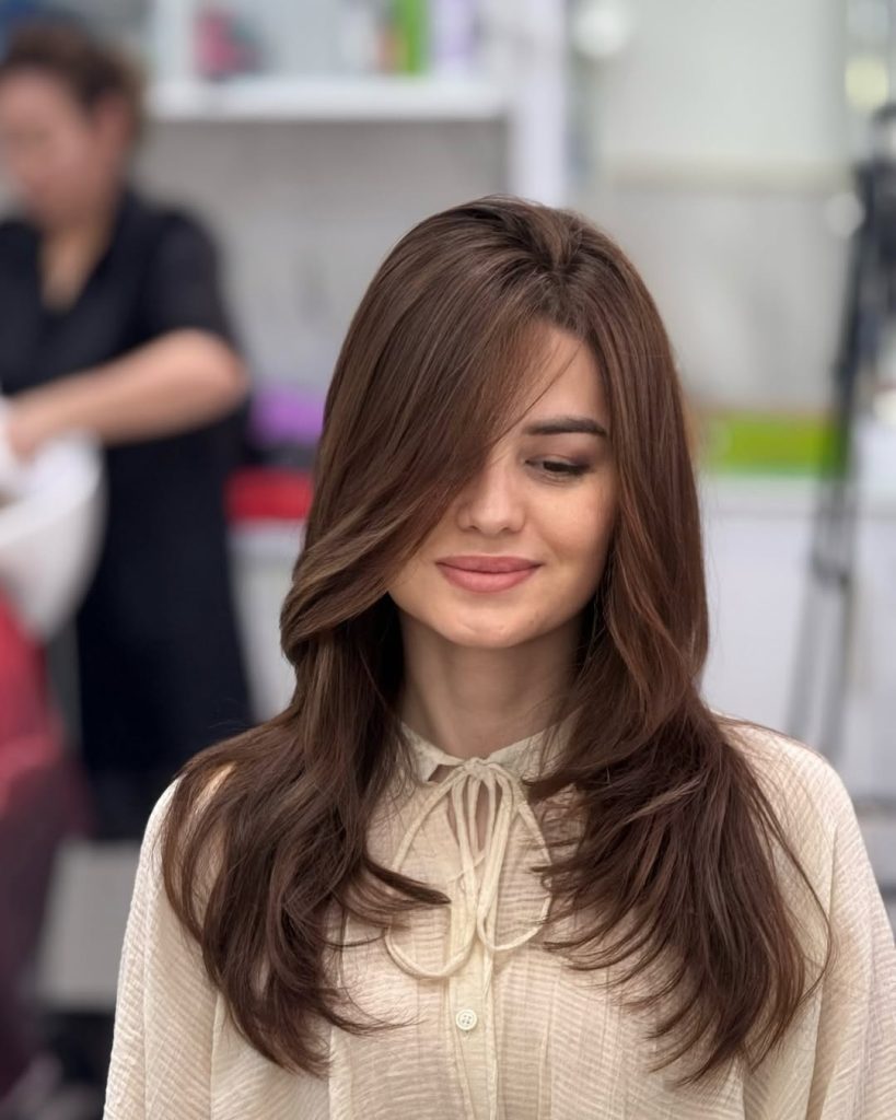 This final look combines long, layered hair with soft, sweeping bangs that blend naturally into the rest of the cut. The side part plays a key role in balancing facial roundness, while the layers add movement and visual length.