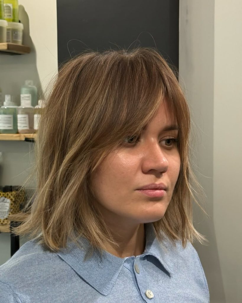This medium-length haircut leans into softness and texture, making it especially flattering for round faces. The full bangs skim the brows without appearing blunt, while the layered lengths fall effortlessly around the shoulders.