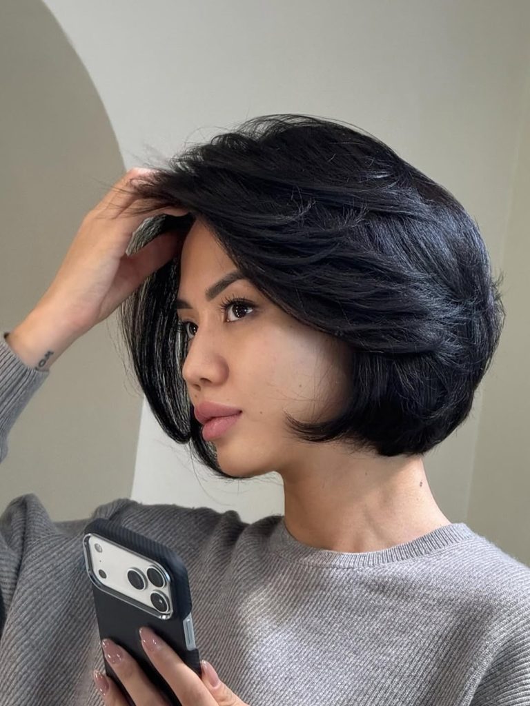 It’s a confident choice for women who want a modern, editorial feel without sacrificing wearability. A side part enhances the angular effect, making this one of the most requested short-layered looks in salons this year.