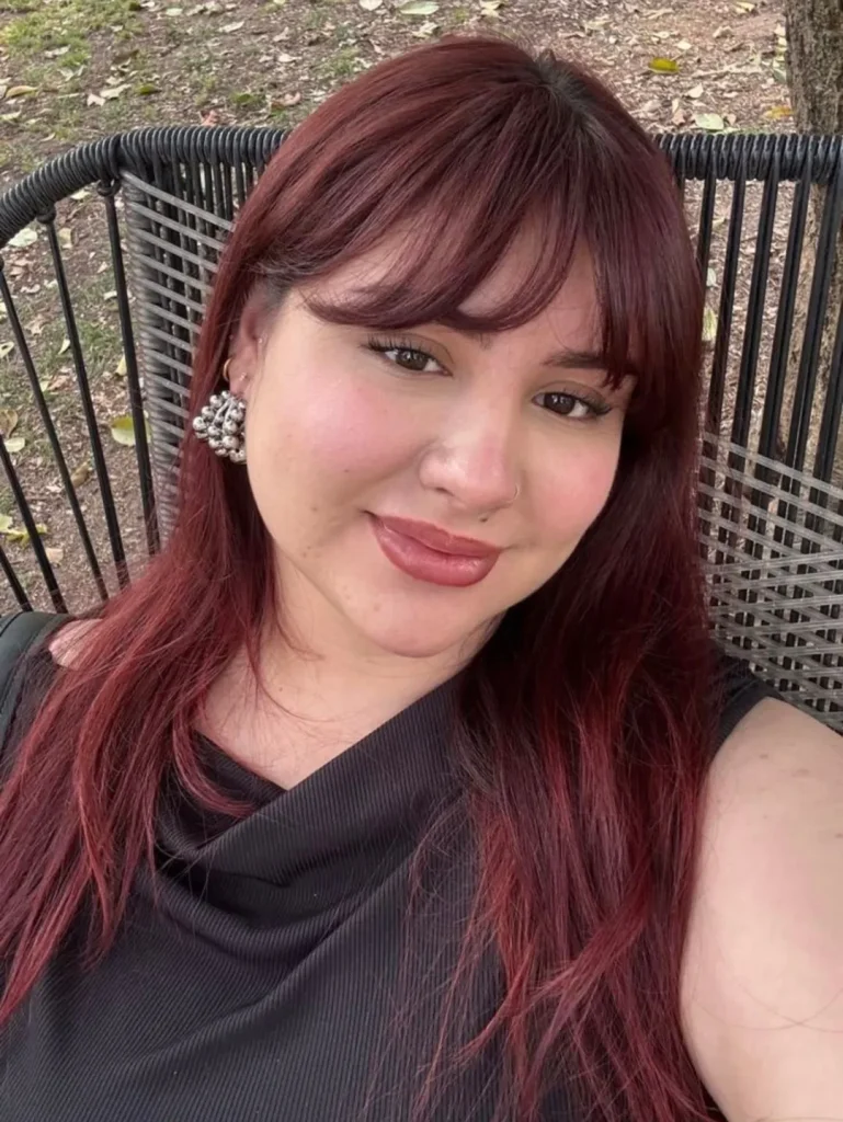 This is one of the most universally flattering cuts for round faces right now. The medium-length hair with layers and bangs combination softens facial fullness while adding movement and personality. The bangs aren’t blunt—they’re airy and slightly parted, allowing the face to breathe visually.