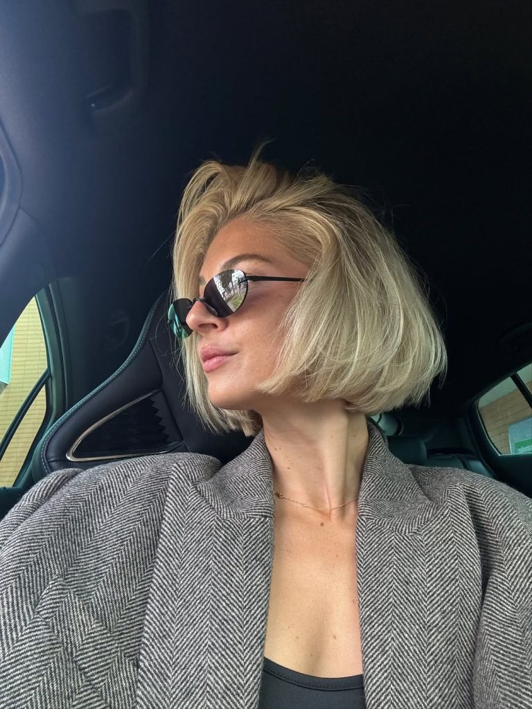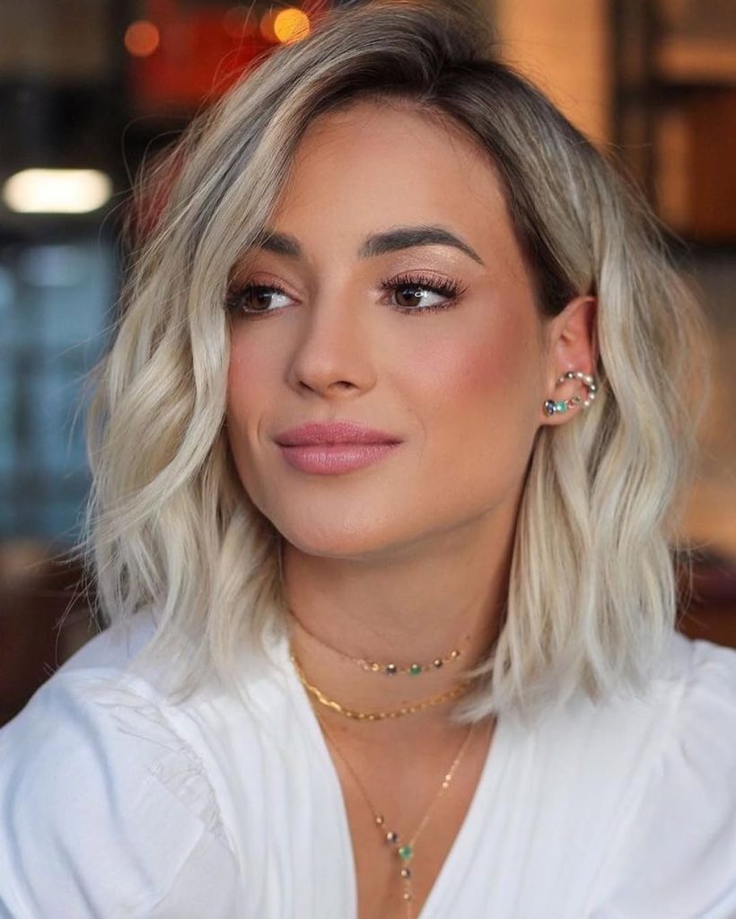 Softly graduated just below the jaw, this short bob carries a glamorous side sweep and champagne-to-platinum blend. Minimal layering keeps the outline crisp, while micro-layers inside help the wave set naturally.
