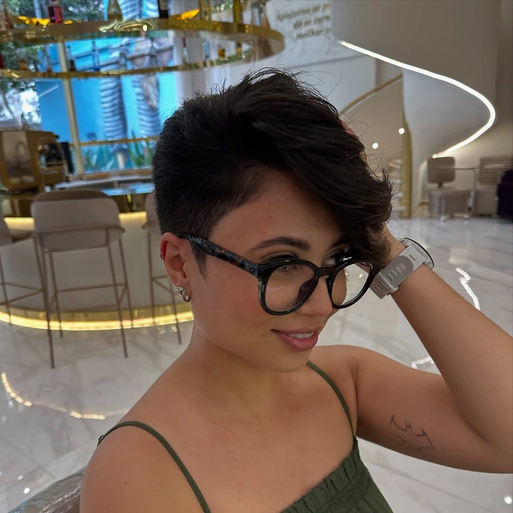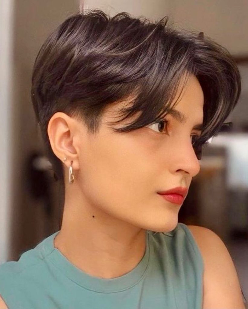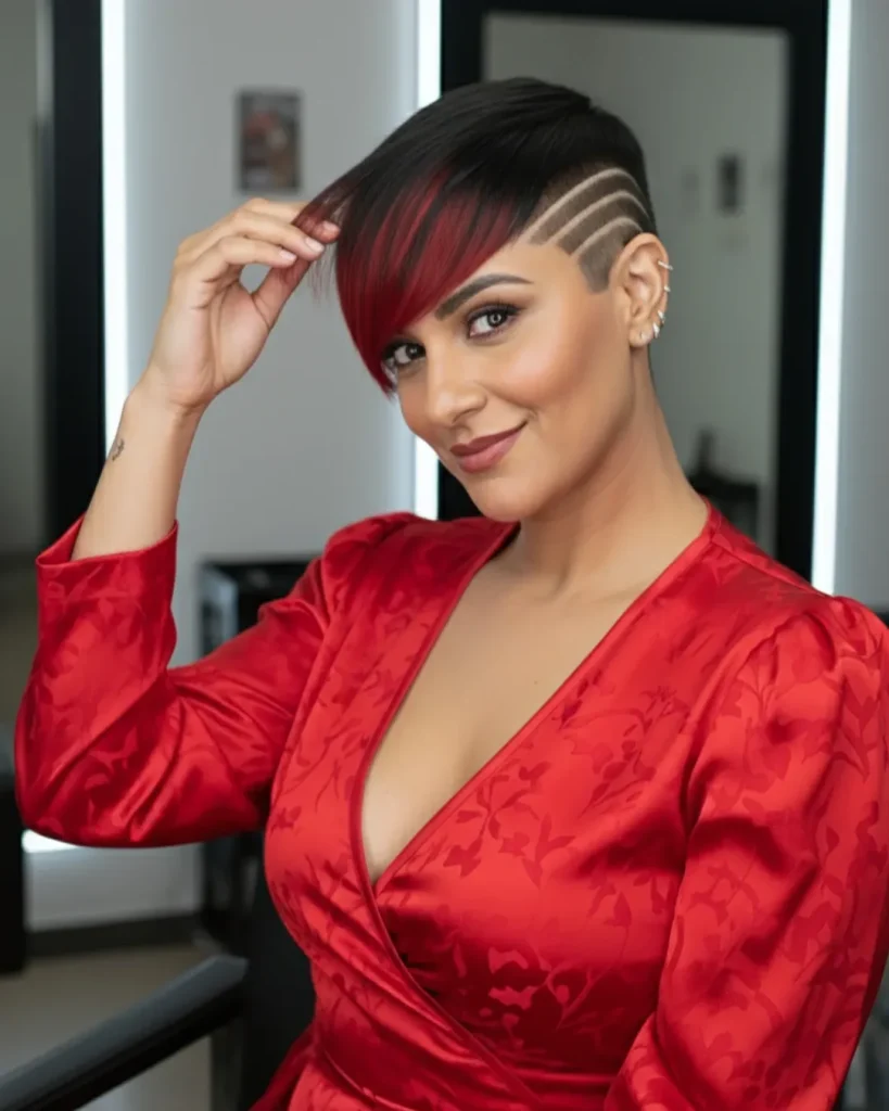 Bold, tailored, and nightlife-ready: a tight undercut with carved stripes, a jet base, and a crimson sweep with bangs. The contrast creates instant height at the crown—great for thin hair seeking drama—and the sleek side keeps the look refined rather than chaotic. Wear the fringe forward for impact or push it up for a softer read. This statement crop adapts across textures (it’s a powerful option for Black women as well), and it photographs beautifully for events. Keep edges crisp every 3–4 weeks to maintain the graphic line.