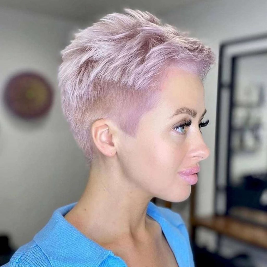A playful micro-pixie with a pastel-lilac tint and tight fade through the sides. The crown is texturized so it stands with a touch of powder—no helmet hair, just airy lift.