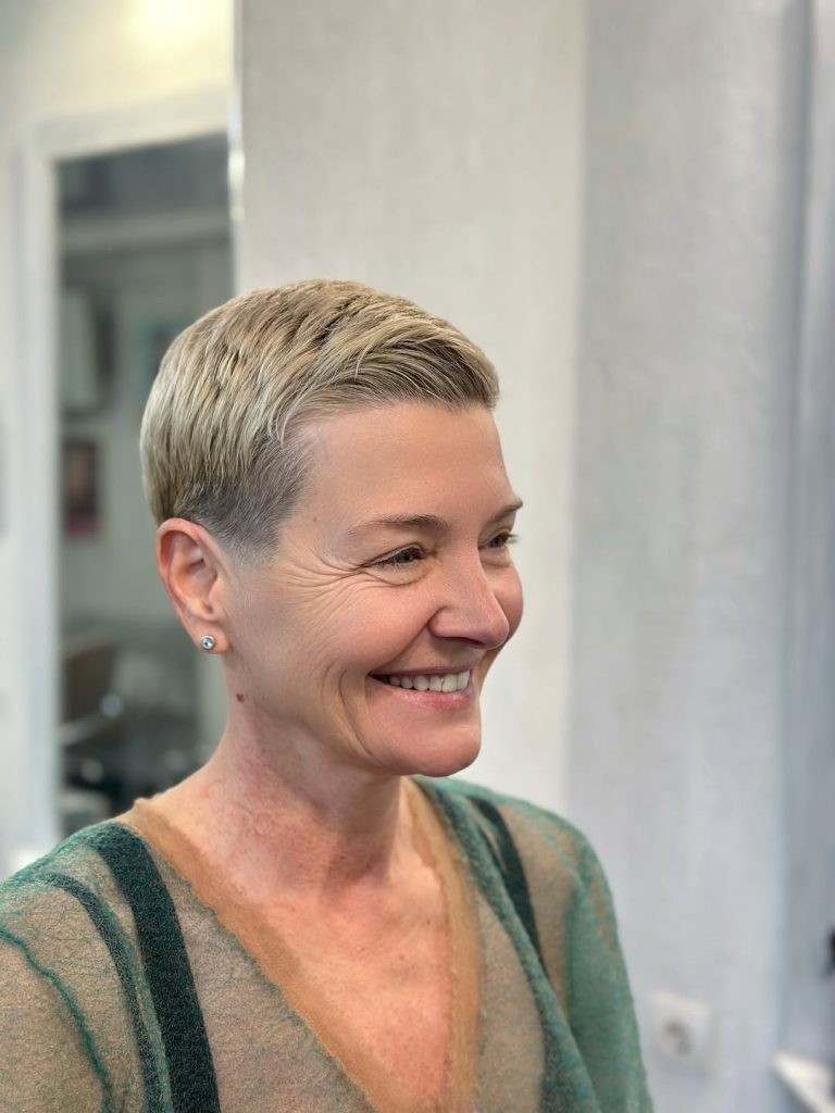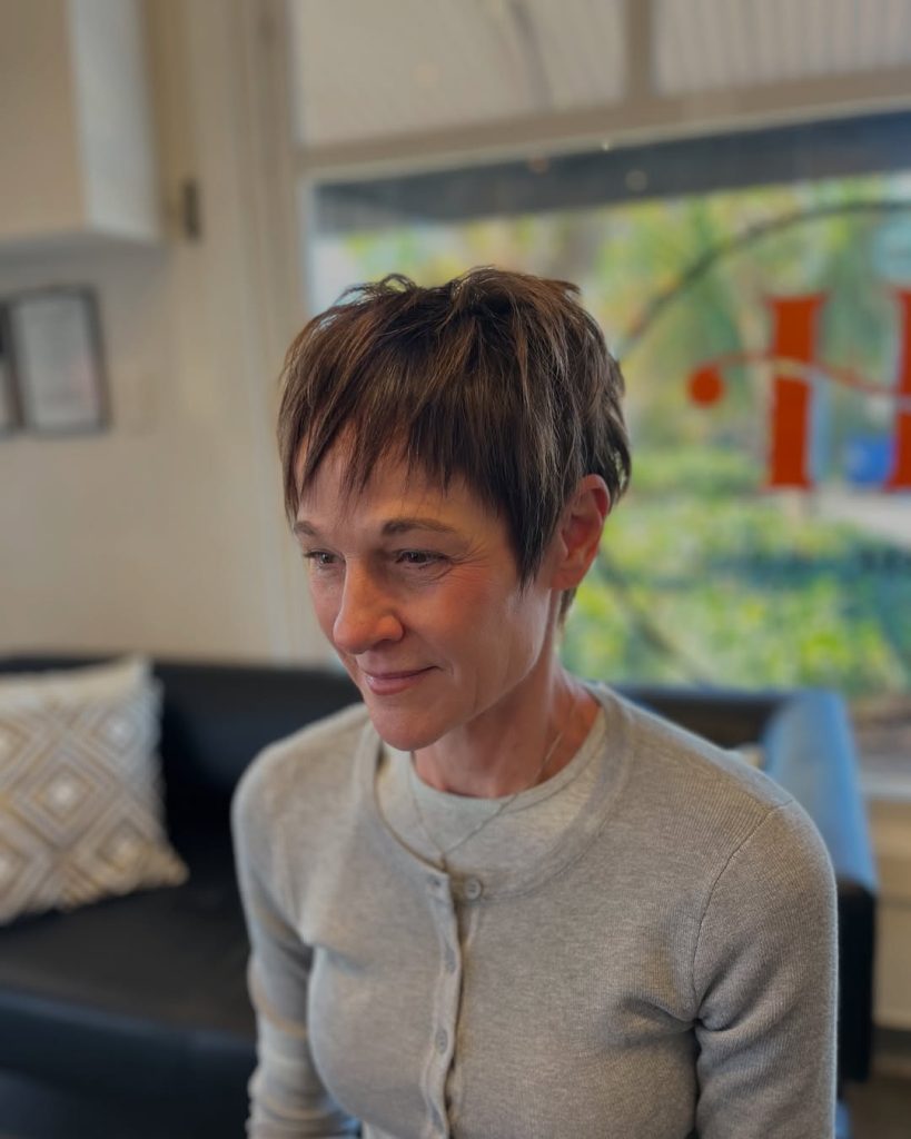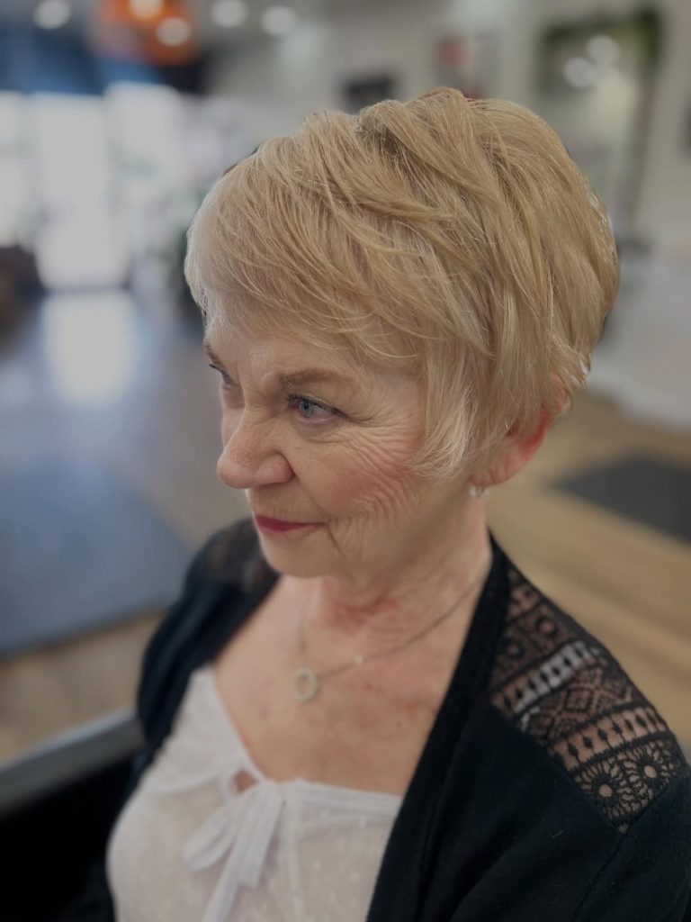 A delicate pixie with silk-fine layering and a side-swept veil that performs like whisper-light bangs. The detail around the temples softens features and adds youthful movement—ideal for women over 60 and lovely for thin hair over 50. Keep the crown a touch longer for a gentle lift, then finish with a dab of volumizing powder tapped at the roots.