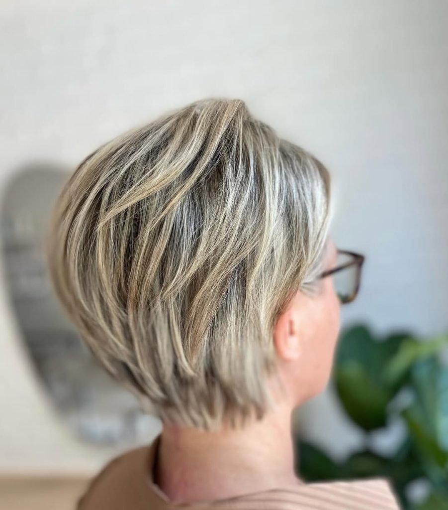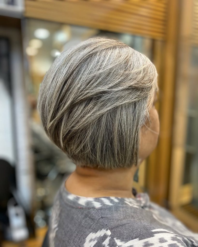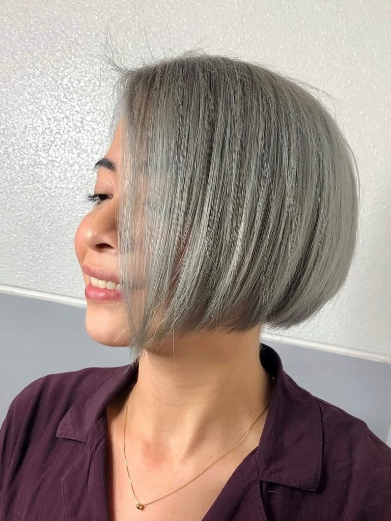 Clean lines meet lived-in silver. The nape is tailored close, while the crown carries directional layers that swoop diagonally, creating an elongated, elegant profile. Because the perimeter stays compact, this bob behaves beautifully on straight textures and controls bulk on thick hair. The side sweep acts like soft bangs, which is slimming for round faces and glamorous under glasses. If you’re embracing grays, follow Allure and Harper’s