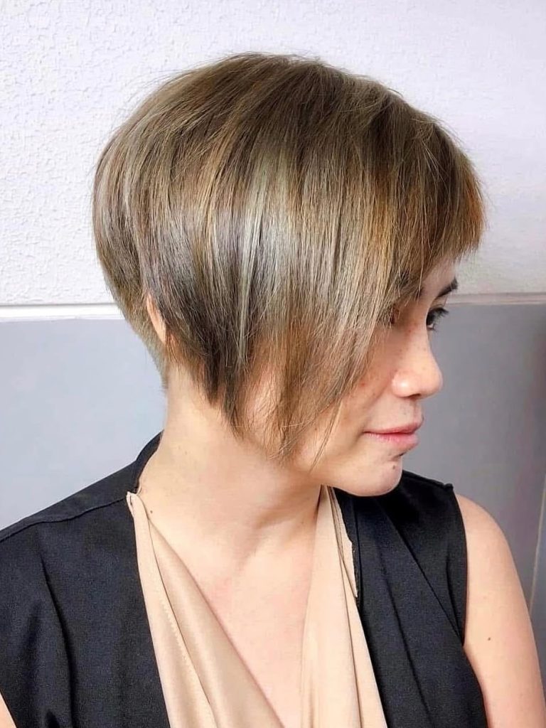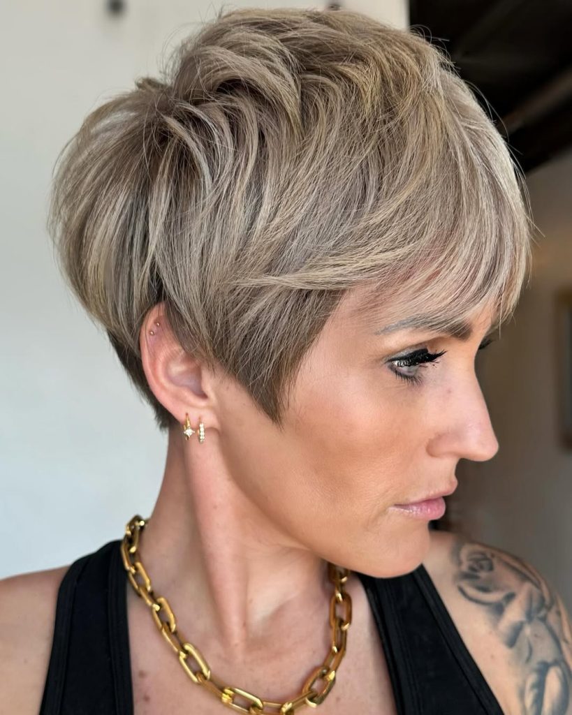 This plush pixie is all about interior texturizing and a silky, forward fringe with bangs. The close nape keeps everything neat, while the crown carries soft volume—ideal for thin hair that needs height and control. A touch of volumizing powder at the roots, then a pea of molding cream through the ends, gives touchable fullness that lasts. Works on straight or softly wavy strands and reads chic at the gym, office, or date night. Consider a neutral beige-blonde gloss to highlight the movement—subtle but fashion-editor approved.