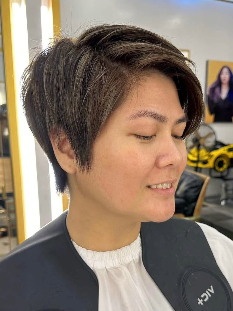 A gently layered short cut that skims the cheekbones and drapes into a side veil. The airy top adds lift, while tapered sides refine the silhouette, making it friendly for round faces and practical for thin hair. It’s a great everyday shape for commuters and moms—quick dry, finger comb, done. If your strands carry some bend, lean into it: a light cream defines wavy movement without stiffness. Consider warm mocha lowlights to deepen dimension and emphasize the feathery texture. Classic, wearable styles for busy women who still want a fashion edge.