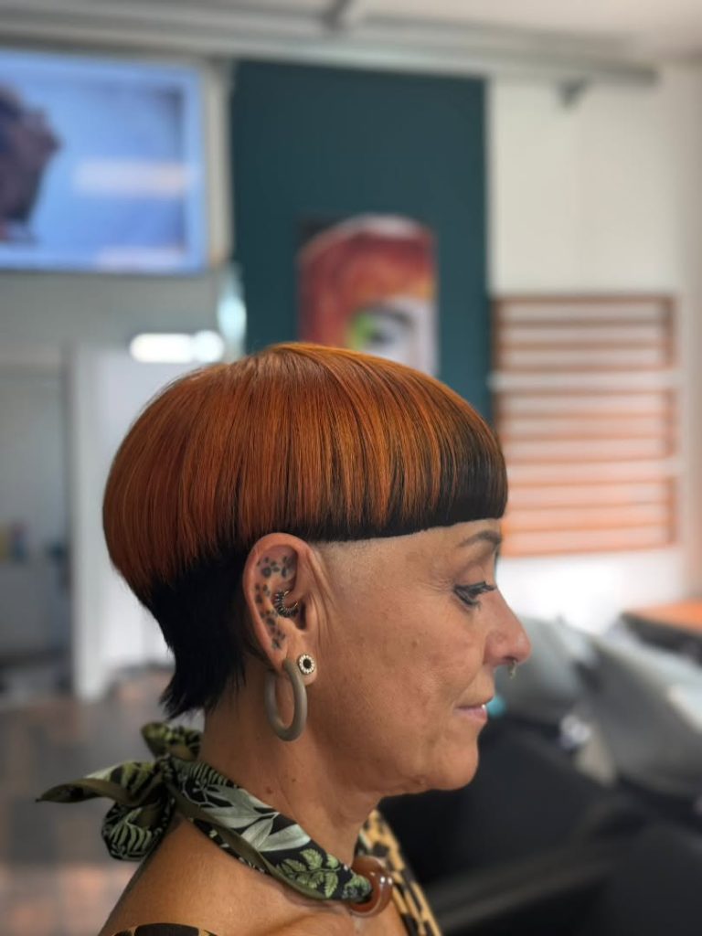 High concept meets precision: a glossy copper bowl sitting over an ink-dark under-shave. The line is intentionally architectural and looks razor-sharp on straight hair; the underlayer removes bulk, so it’s surprisingly workable on thick hair. Keep the fringe crisp at eyebrow level and ask your stylist for micro-texturizing beneath the surface so it moves, not helmets. Styling is minimal—flat brush, low heat, shine spray. This is a runway-leaning idea for fashion-forward women who love graphic shapes and want conversation-starting ideas in 2026.