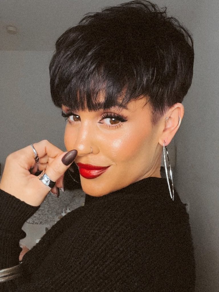 A plush, jet pixie that’s all about airy movement across the brow. Choppy texture at the crown builds lift (magic for thin, fine hair), while the wispy fringe keeps it playful and cute. A dab of volumizing powder at the roots plus a touch of shine on the ends gives that “done but not stiff” finish. Works beautifully on straight and lightly wavy hair and is a confident style choice for round faces—the feathery top adds vertical balance. If you love hoops, glam makeup, and low-fuss routines, this is pure Women easy energy with endless styling ideas for 2026.