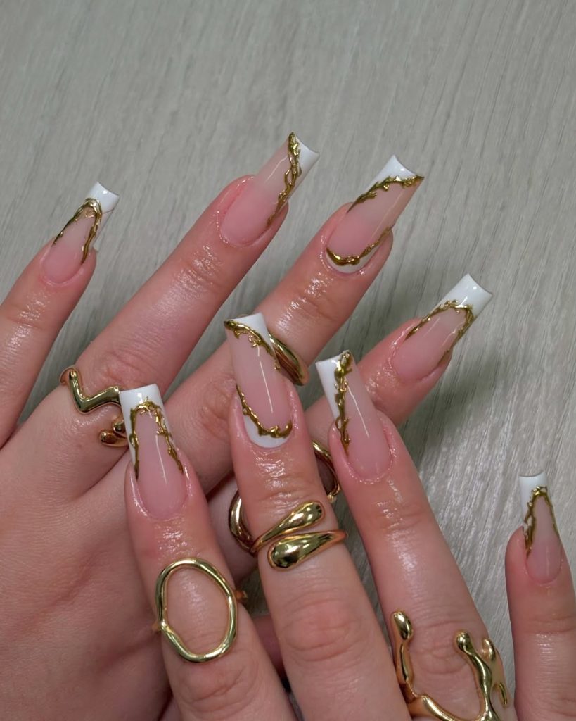 Liquid-gold edging turns a crisp white French tip into jewelry. The architecture is long and square, which gives the gold a runway to flow in irregular, organic lines—sophisticated without being fussy. I love this for black-tie RSVPs or a tailored pantsuit; the set functions like stacked rings.