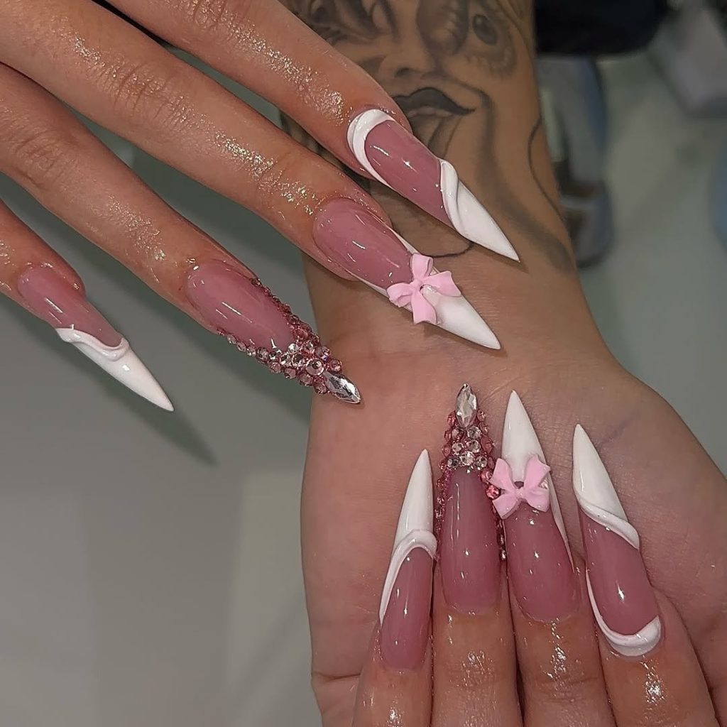High-gloss pink acrylics meet pointed tips and a split French tip curve, then go full glam with crystal pavé and tiny bow appliqués. It’s unabashedly girly and unapologetically cute—the kind of set I reach for when a simple LBD needs personality.