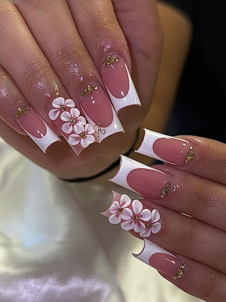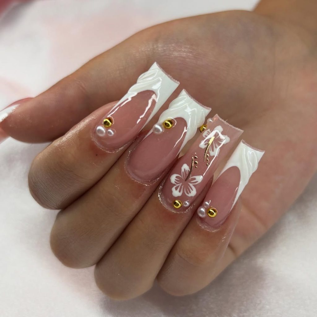 A quintessential short/short square base keeps this floral design story wearable for busy weeks. The milky white tips read “timeless,” while clustered 3D blossoms and petite gold studs add whimsy.
