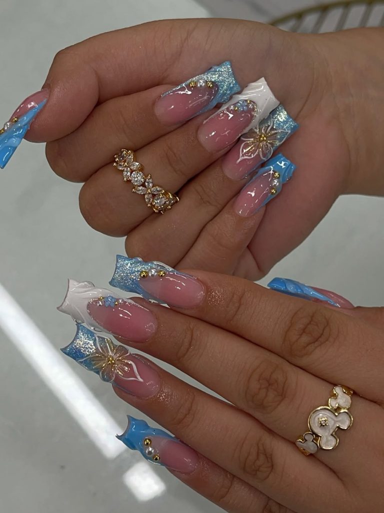 An aquatic remix of the French tip: frosted blue swirls, pearly white crests, and delicate butterfly hardware cresting on a long square canvas. It’s playful yet polished—perfect for summer vacations, rooftop cocktails, or a pop against monochrome outfits.