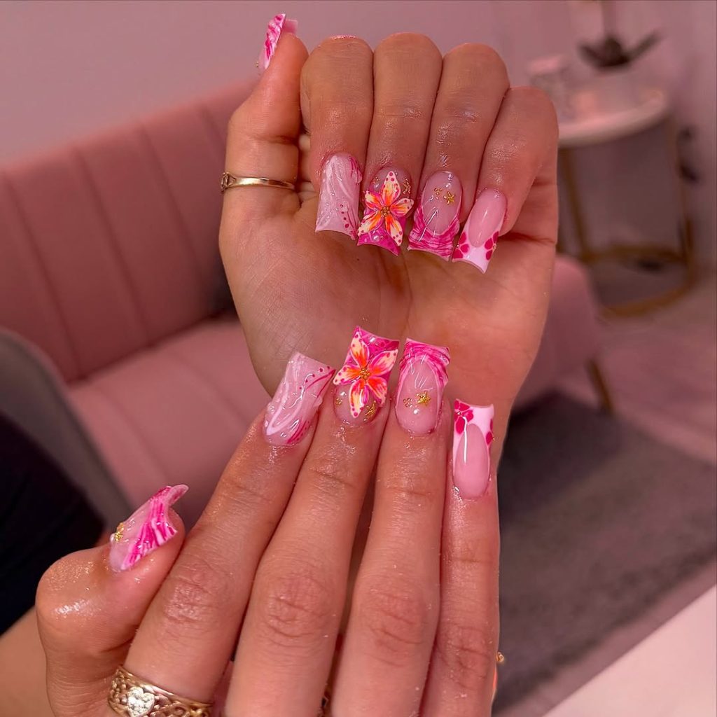Think gallery-wall nails: vivid Pink marbling, soft veining, and hand-painted petals tipped with micro-foils. The silhouette leans modern and square, long enough for impact but still practical for typing and errands.