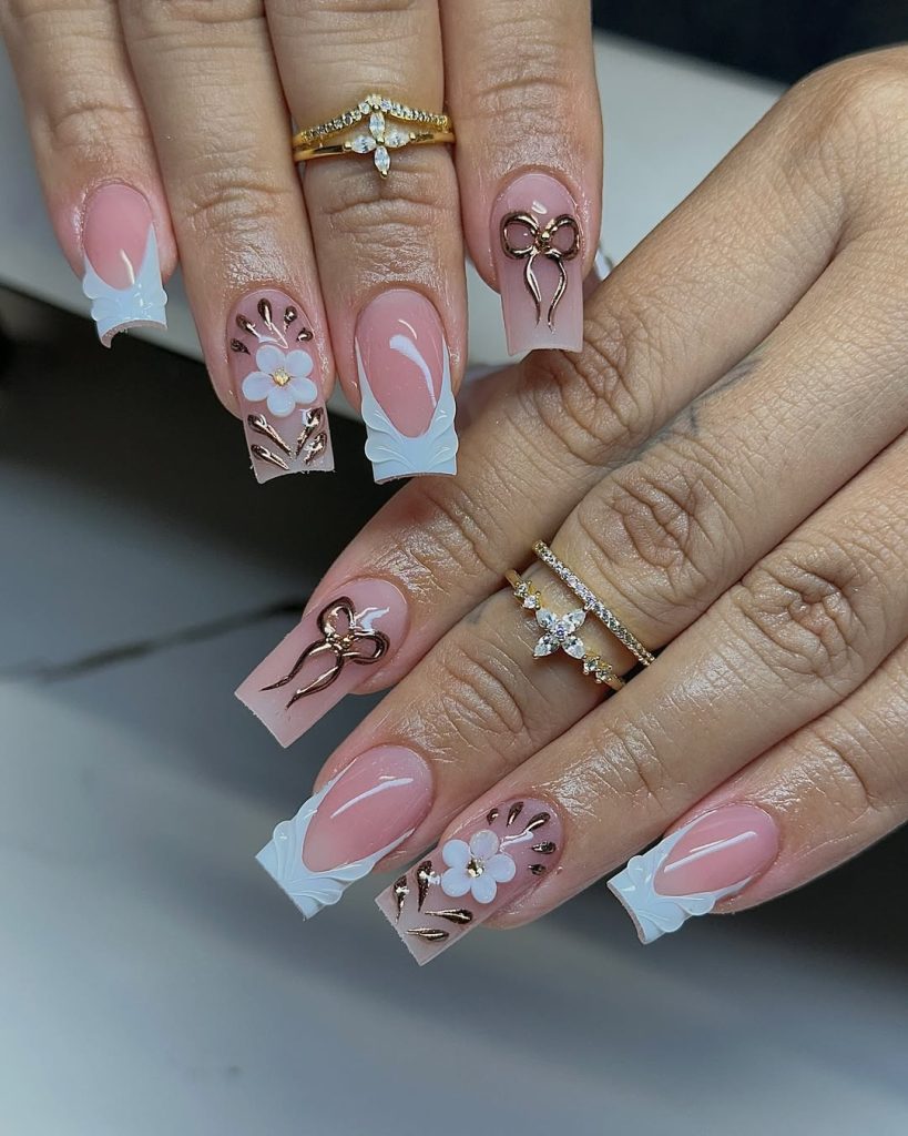 Sculpted white ribbons wrap a blush base, punctuated by rose-gold filigree and one delicate blossom. The shape is softly square—universally flattering for 9–5 life—and the palette keeps it simple yet luxe.