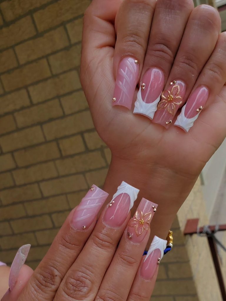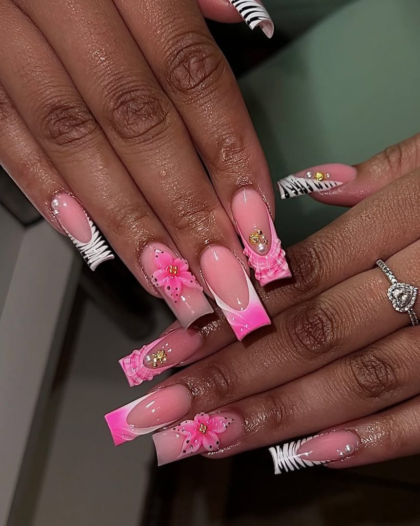 High-gloss Pink gradients meet zebra striping and sculpted blossoms dotted with micro crystals. The tapered long square shape gives the floral work a stage, while a side-swept French tip curve elongates the nail bed—flattering on every hand.
