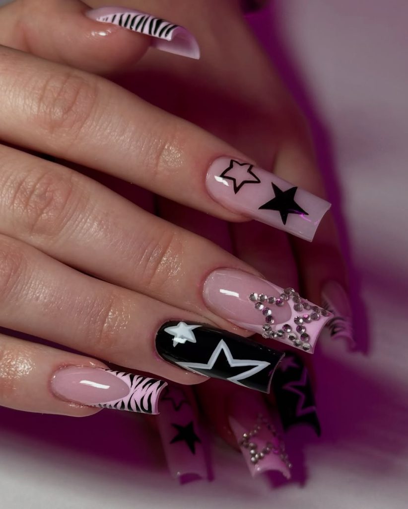 Graphic stars and a flash of zebra print give this set a rocker-Barbie mood. The glossy blush base keeps it wearable, while one jet-black feature nail carries a bold outlined star; a second nail frames a crystal-studded star for dimension. On a sleek, long, square silhouette, the negative space makes every element breathe.