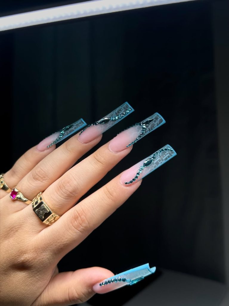 A futuristic take on the French tip: translucent teal edges etched with circuit-board motifs, then dotted with gemstone “comet tails.” The elongated long/long square canvas reads editorial but is still practical when the sidewalls are kept slim.