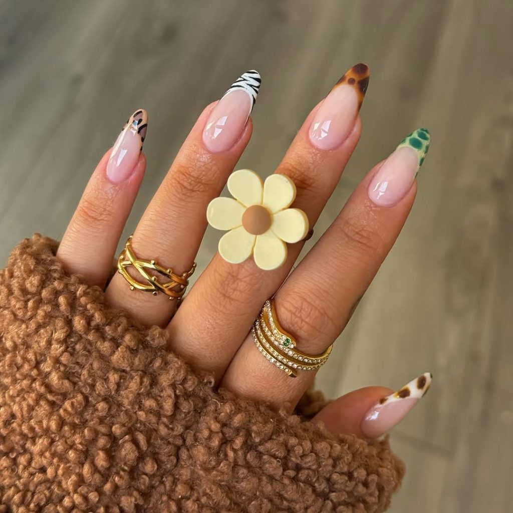 Each fingertip wears a different micro-print—zebra, tortoise, cheetah, and soft reptile—curved into minimalist French tip smiles on a natural base. On medium almond shaping (short-to-mid length), it’s playful but office-friendly.