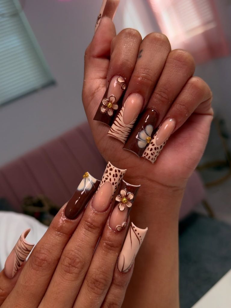 A coffee-bar palette (latte, cappuccino, and espresso) collages florals, zebra swipes, and speckled tips across alternating nails. The mix feels editorial yet grounded, thanks to glossy depth and clean square edges.