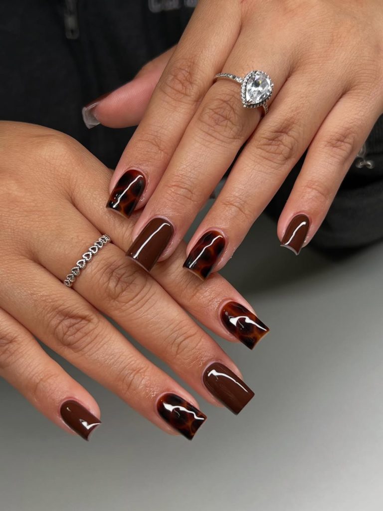 Proof that “short” can still be a statement. High-gloss tortoiseshell panels sit alongside solid chocolate, all on a crisp, short square silhouette. The glassy topcoat gives salon-fresh depth for weeks.