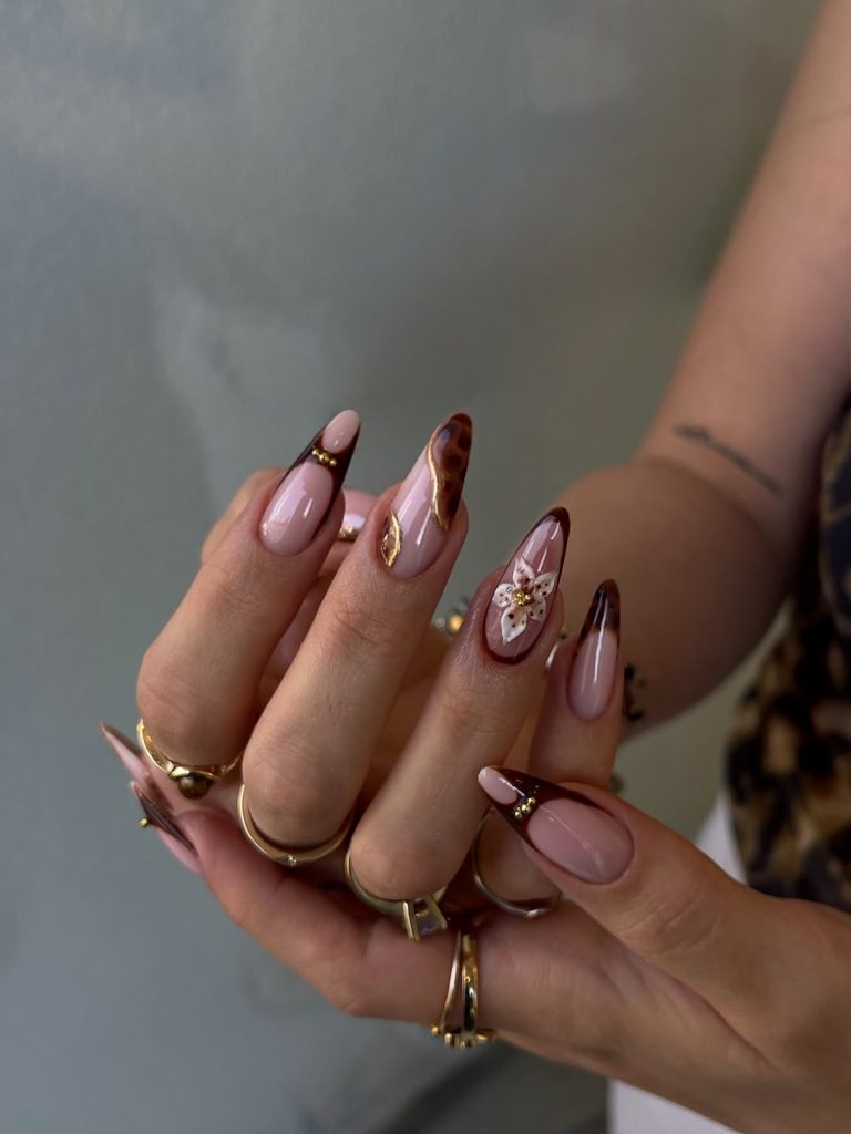 The warm tortoise arc that sweeps each tip is edged with a whisper of gold, then softened by a single sculpted blossom. The medium length and tapered almond silhouette feel refined—an easy upgrade from neutrals when you want polish without shouting. Ask your tech for a sheer beige base to elongate the nail bed and a thin, glossy French tip ribbon in caramel tortoise.