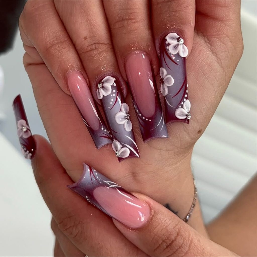 A cool mauve-to-plum gradient frames glossy pink ovals, finished with airy 3D flowers and dotted swoops. On a crisp, long, square base, the negative space reads architectural while the florals stay delicate—a very “special-occasion mani” that still works with a blazer and denim.
