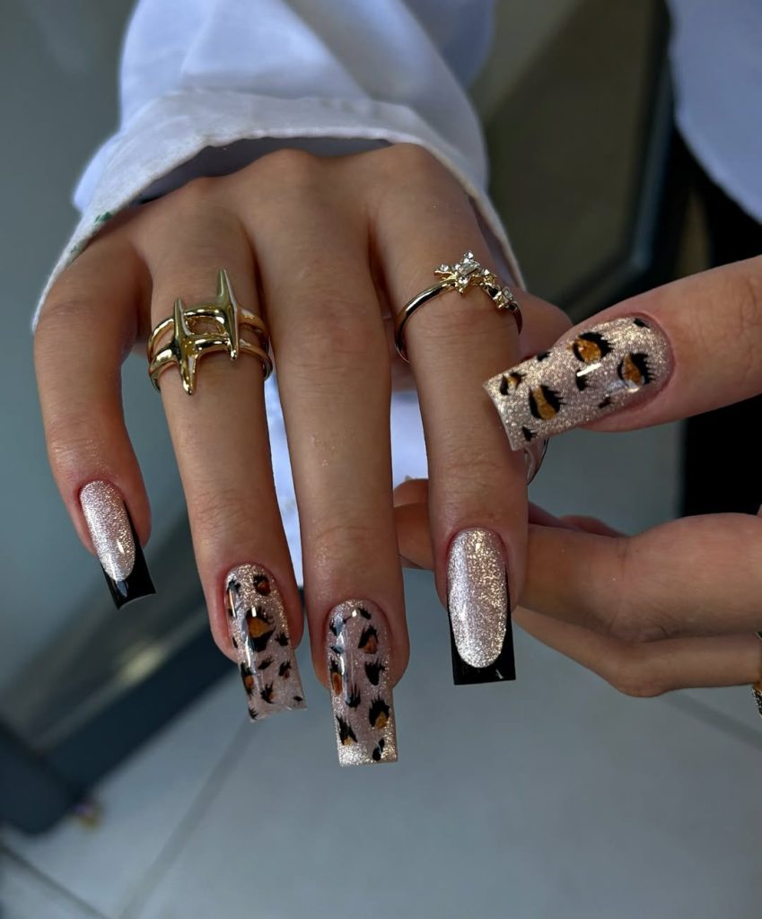 Champagne sparkle meets soft leopard spots, punctuated by razor-clean black smiles on the index and pinky. It’s the balance of texture and restraint that makes this set feel grown-up. Keep the free edge a touch squared for that sleek, camera-ready finish.