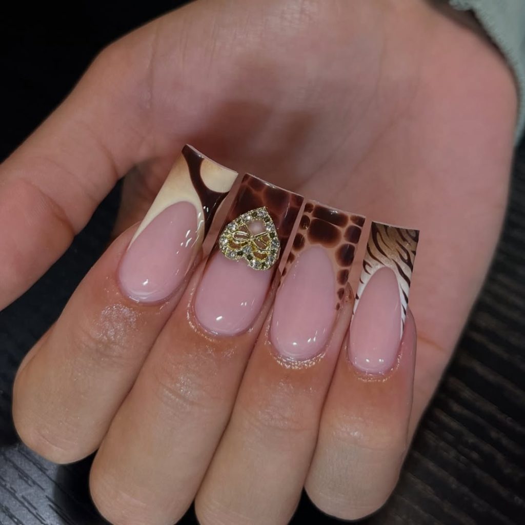 Four riffs on rich mocha—speckled, reptile, zebra, and deep gloss—wrap clean windows of nude, then a single gold heart sits like jewelry on the center nail. The uniform long square silhouette keeps the collage cohesive and chic.