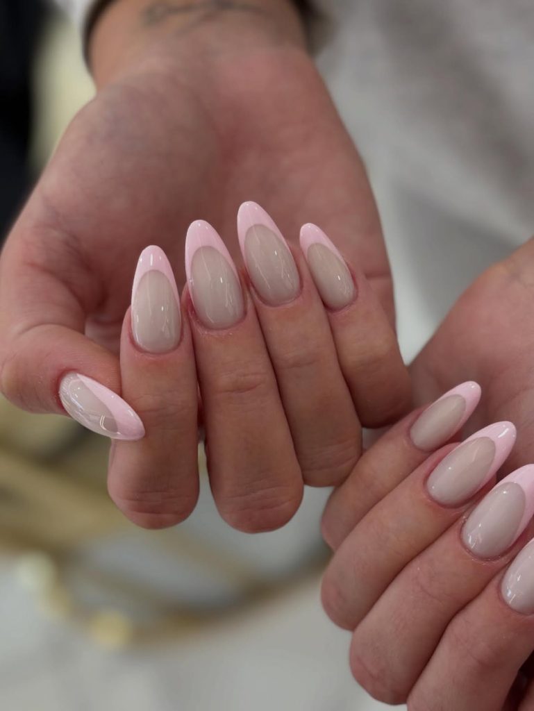 A whisper-light pink edge traces the perimeter, leaving a glossy, translucent center that makes nails look airbrushed. It’s the manicure equivalent of a great white T-shirt—quiet luxury, endlessly repeatable. The softly tapered almond shape flatters every hand.
