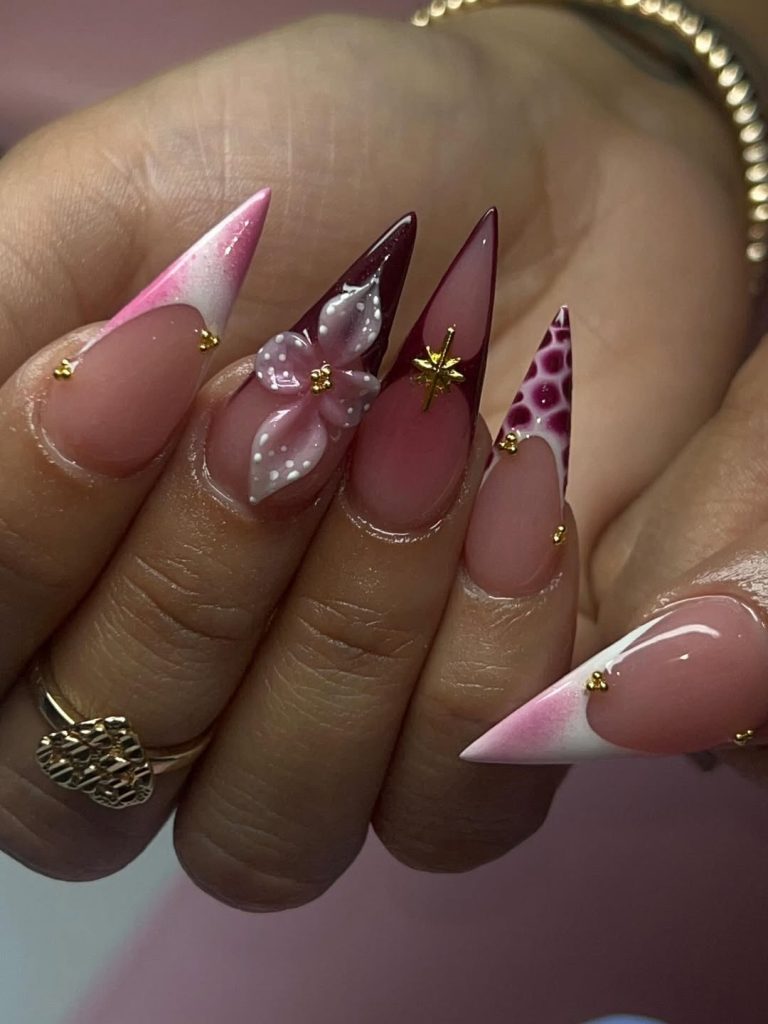 A berry-to-pink ombré sweeps into razor-sharp points, alternating with a reptile-textured accent and a sculpted blossom dotted in micro pearls. Tiny gold stars add a whisper of light. The look is high-impact but wearable thanks to sheer, elongated nail beds that keep the palette soft.