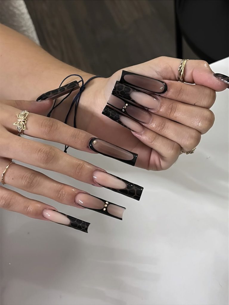 A cool study in contrast: sheer beige windows bordered by glossy black frames and croc-textured tips, punctuated with a micro gem trio. The uniform long square silhouette makes the artwork feel architectural and sleek.