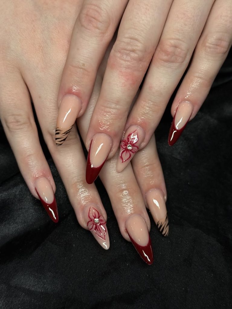 A deep red contour French tip skims the perimeter of a sheer nude base, flanked by a hand-drawn blossom and a subtle tiger flick for attitude. The tapered almond shape keeps it feminine and elongating.