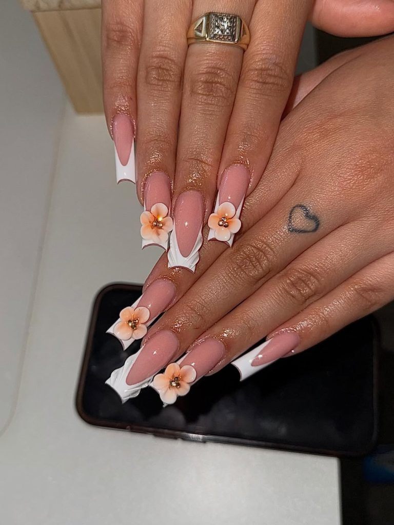 Creamy, sculpted white tips ripple like porcelain, then bloom with soft peach 3D flowers set on glossy nude. The length leans runway, with a gentle taper that reads modern coffin/long square, depending on preference.