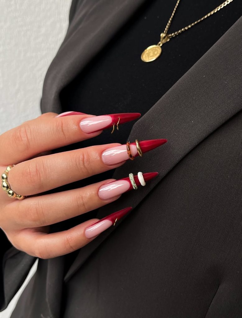 Gloss-glazed nude beads sharpen into ruby points, then are “pierced” with tiny stacked bands—an editorial jewelry moment without the snag. Clean, slim sidewalls keep the dramatic length wearable.