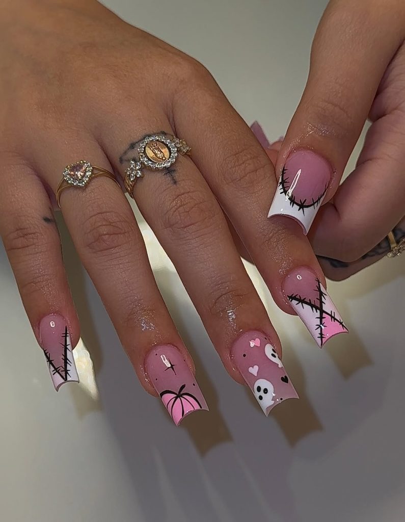 Spooky goes sweet with blush and pink panels, stitched lines, tiny ghosts, hearts, and pumpkins sitting on crisp square tips outlined in white and black. The proportions are tidy, so the theme stays chic.