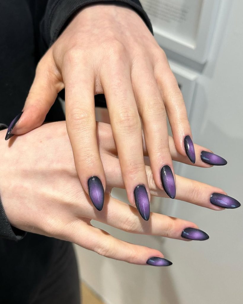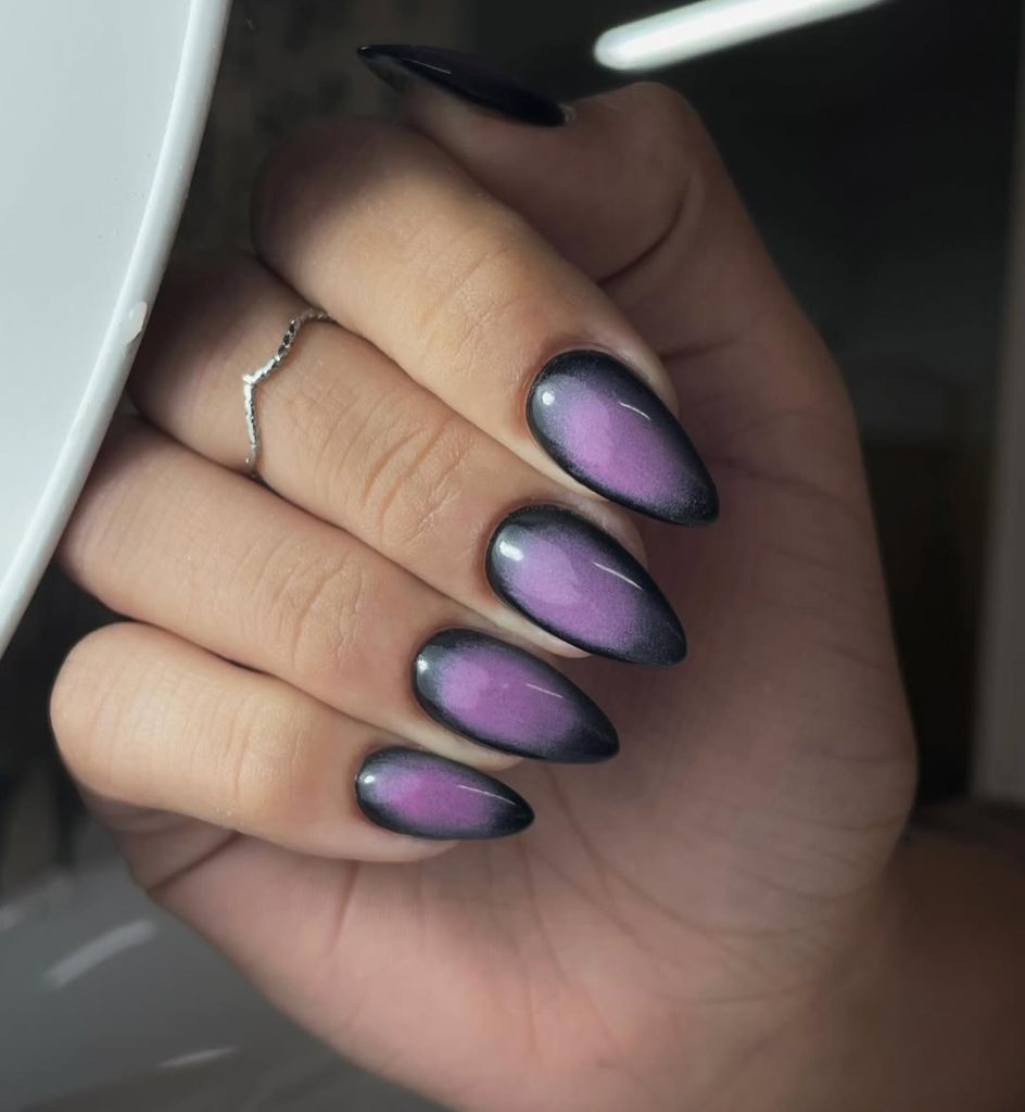 The vibe: a cool-toned purple halo that blooms at the center of an almond silhouette, diffusing into inky edges for a moody, night-sky aura. A fine reflective highlight skims the vertical axis of each nail, adding “glass” dimension without disrupting the gradient—perfect if you love design details that stay minimalist.