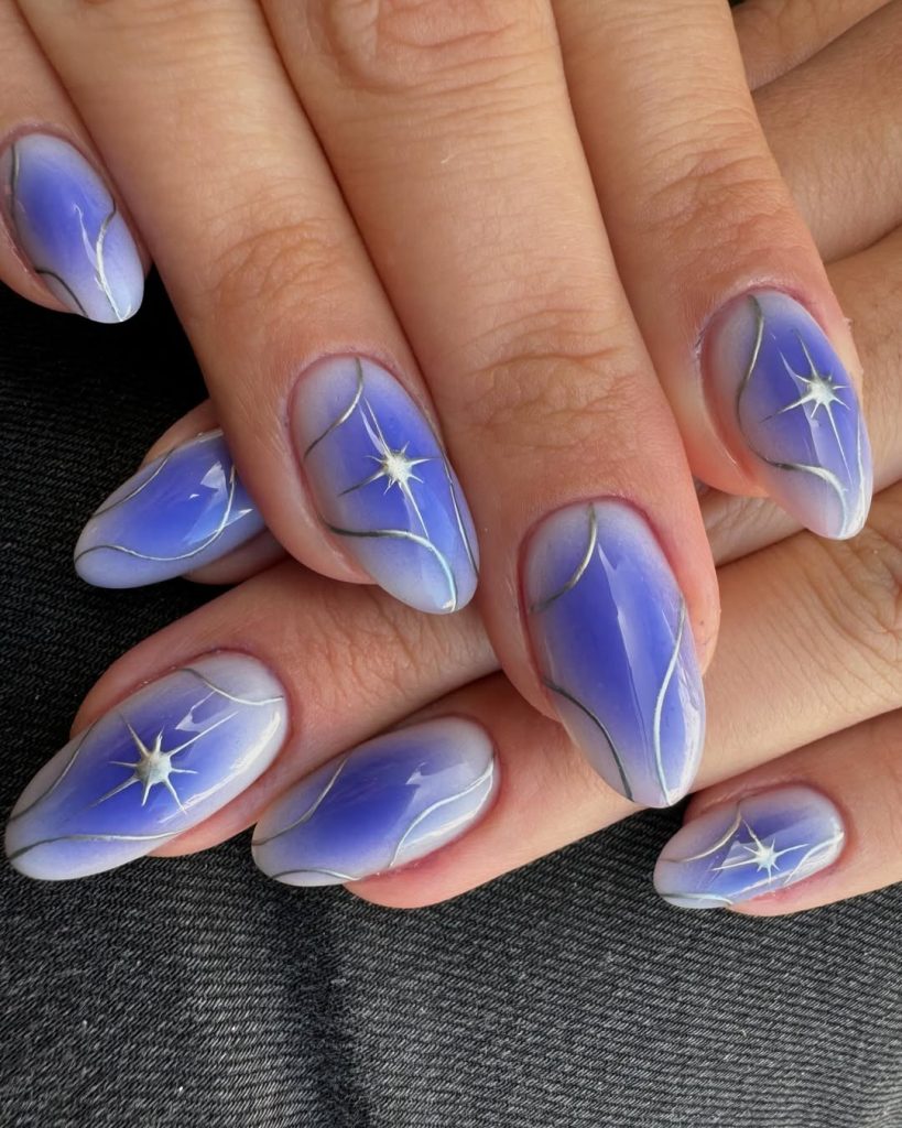 Electric Blue centers fade into cool lavender-gray, laced with fine, silvery constellations—an aura-meets-galaxy design that still feels grown-up. The hand-painted starbursts add “with design” detail without tipping into maximalism.