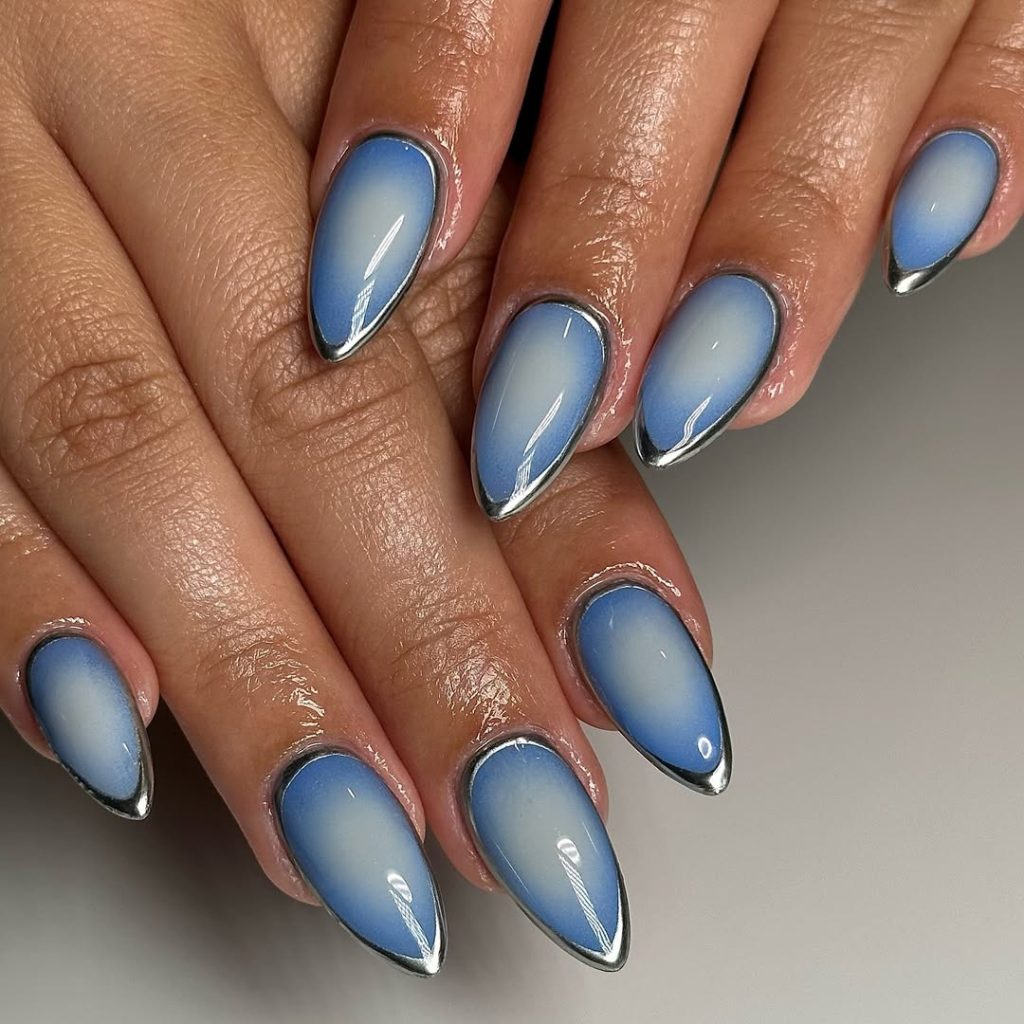 A serene blue center floats over a pale base, finished with molten chrome frames along the tips and cuticle line. It’s futuristic yet clean—ideal if you love accessories and want nails that hold their own.