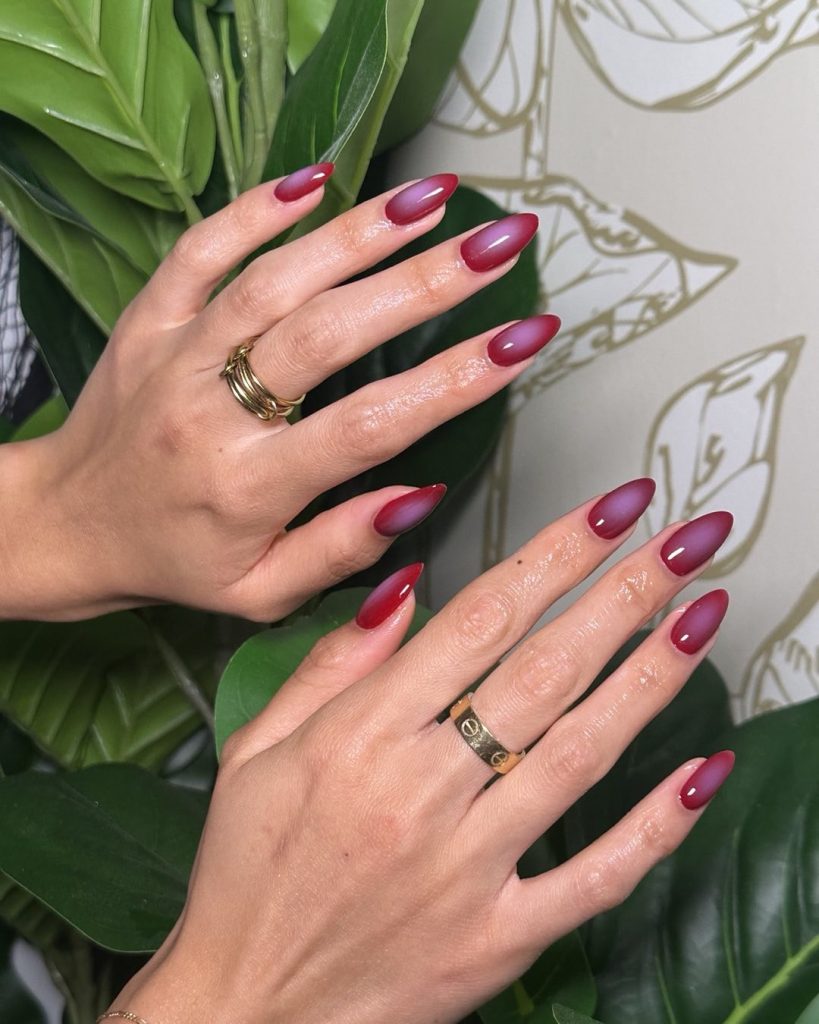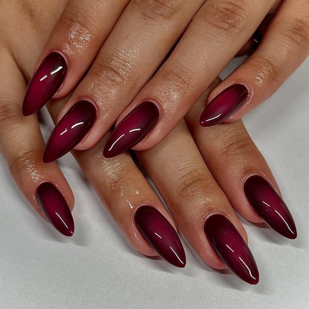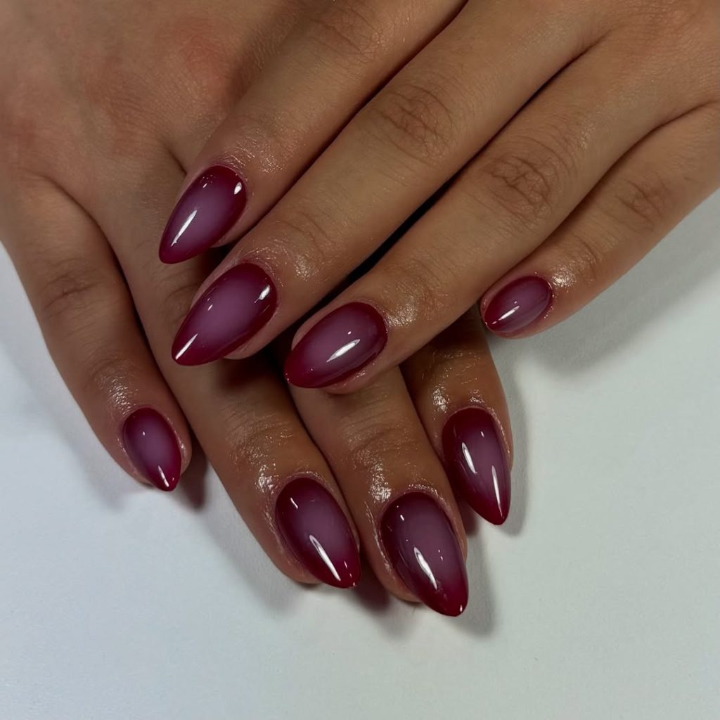 A wine-soaked core diffuses into merlot borders with high-gloss depth. This is the perfect desk-to-dinner aura: sophisticated, mood-boosting, and seasonless (though it sings in fall with camel coats). Ask your artist to keep the cuticle area slightly sheer for graceful grow-out.