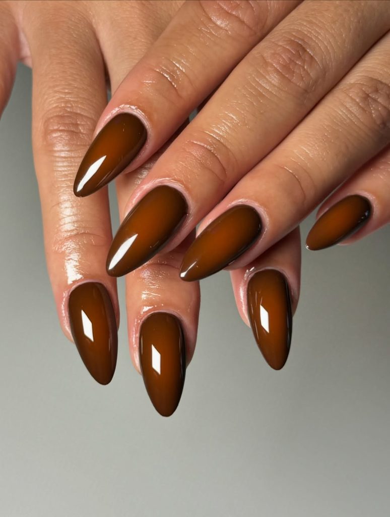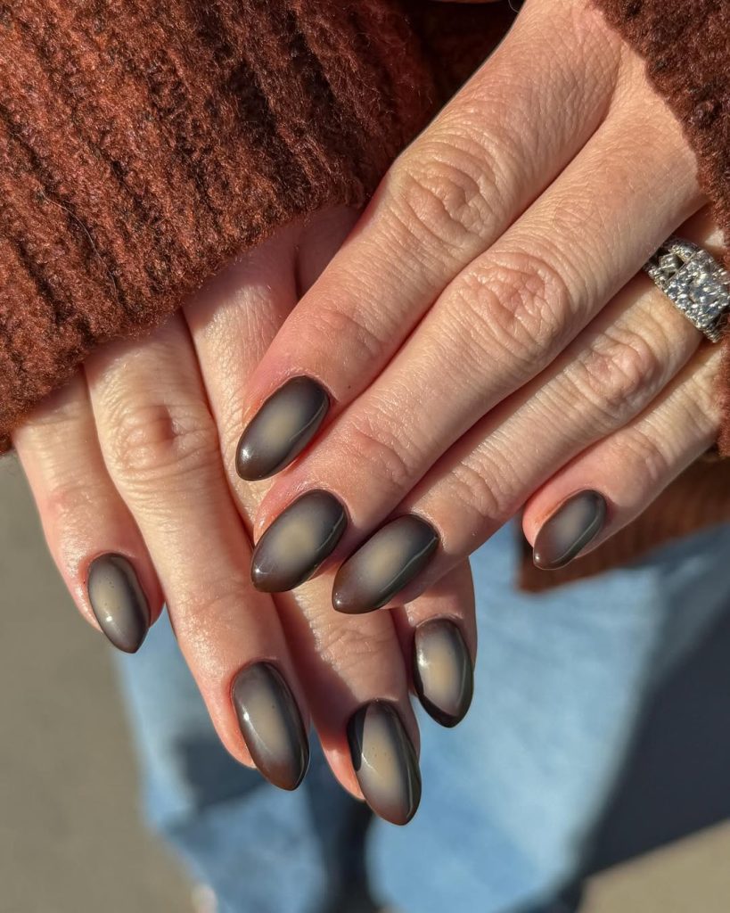A cool-toned brown center with espresso edges expands to a warm aura and embodies a sophisticated coffee-house take on aura nails. The glossy finish is understated, making it a perfect boardroom-ready option while still embracing a trending look.