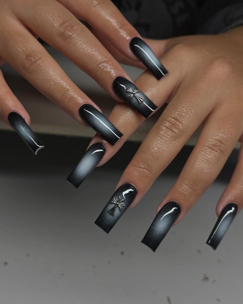 Graphic, city-ready, and a little rebellious. A cool white glow sits at the center of a glossy black aura on long coffin tips, punctuated by a tiny chrome cross charm—“with design ”done the grown-up way. It looks incredible with moto jackets and tailored trousers.