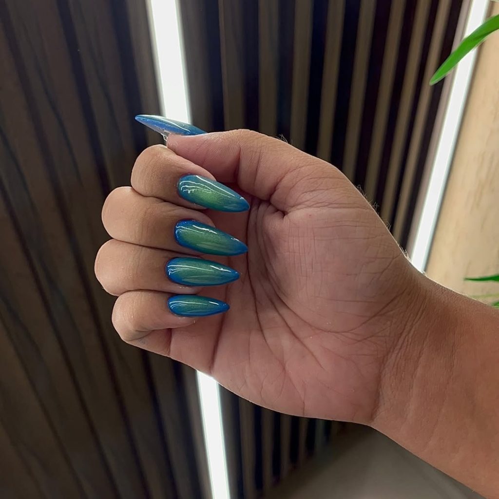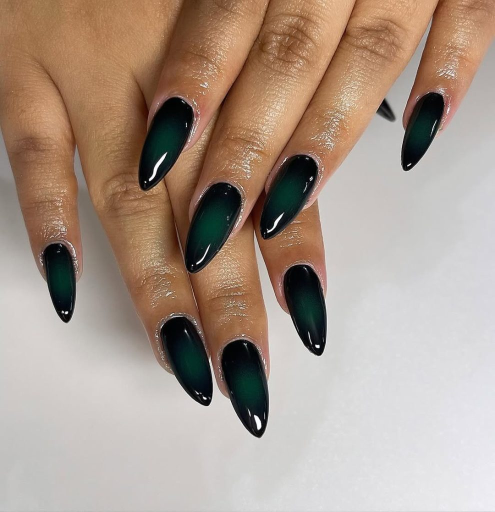 An intense jewel-tone A green center glows through obsidian borders on glossy almond tips. It’s moody without feeling heavy—a chic pivot for early fall, especially with trench coats and suede boots.