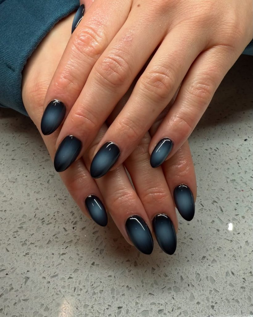 A desaturated blue nucleus melts into slate edges on wearable oval-almond lengths. Think of it as the nail equivalent of your favorite jeans—effortlessly neutral, endlessly outfit-friendly, and wonderfully simple.