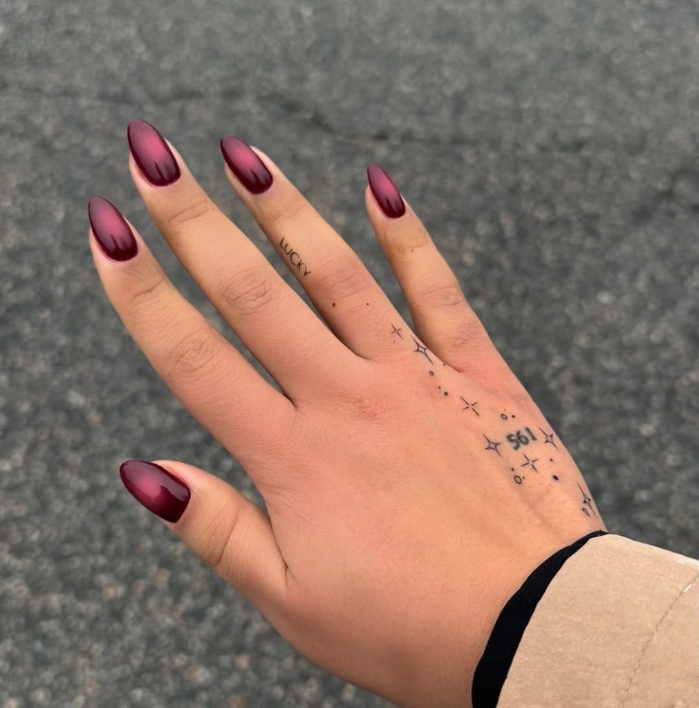 Glossy merlot blooms from the center, fading into wine-stained rims on tidy almond tips. It’s the manicure equivalent of a cashmere scarf—quietly luxurious and perfect from late summer through fall. Pair with a trench, straight-leg jeans, and loafers; the tone warms beautifully against camel and navy.