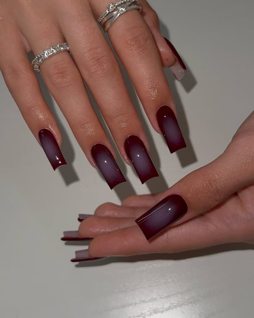 A deep cabernet center melts to charcoal edges on sleek square tips—boardroom sharp with cocktail-hour drama. The glossy gradient feels dark yet refined, a chic alternative to classic crimson red. Pair it with a black slip skirt, a cream turtleneck, and silver hoops for a grown-up, New York-at-night aesthetic.