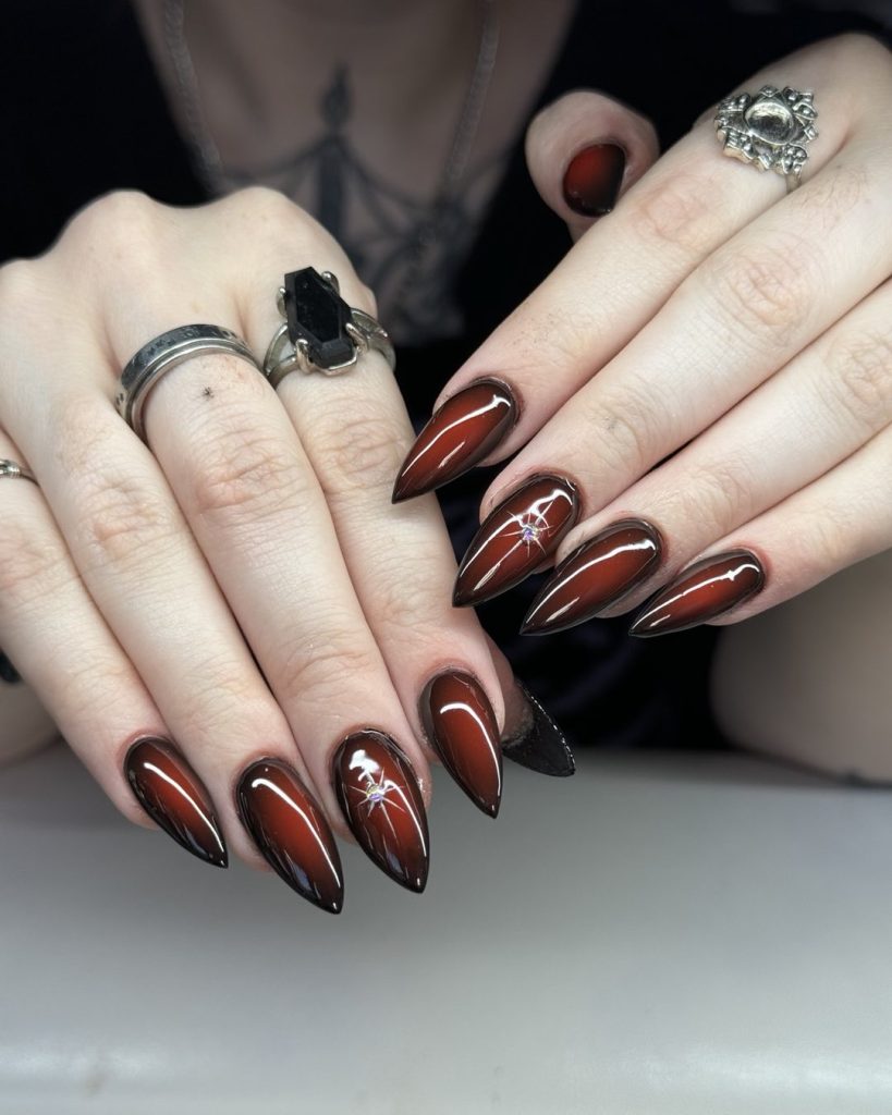 Rich cinnamon-brown centers glow through glossy oxblood borders, then two nails get fine star lines—minimal but definitely with design. The almond silhouette adds elegance that reads luxe with leather jackets and ankle boots—peak fall energy without screaming seasonal.