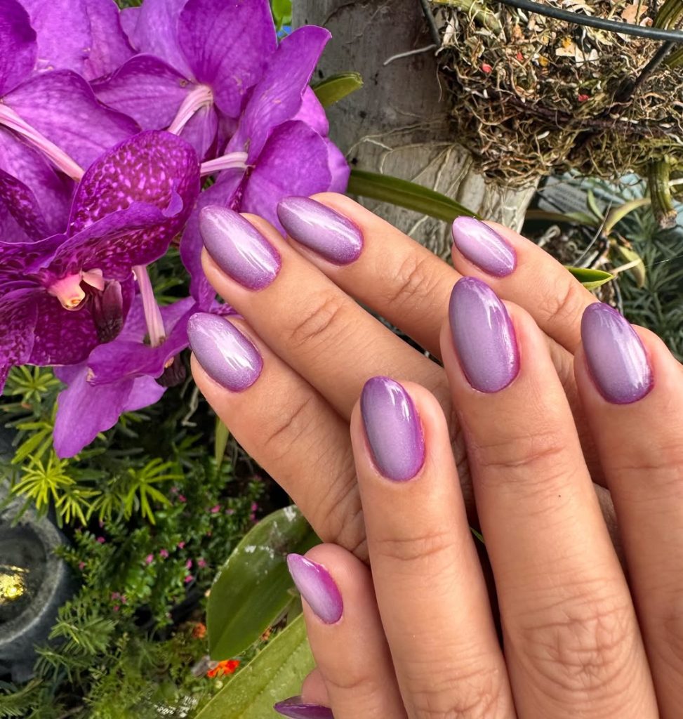 A dewy purple glow blooms from the center and diffuses into soft lilac on tidy almond tips. The micro-shimmer catches light like petals at golden hour—romantic without reading precious. I’d style this with a cream knit set and delicate hoop earrings for an everyday, feminine aesthetic that still works for meetings.