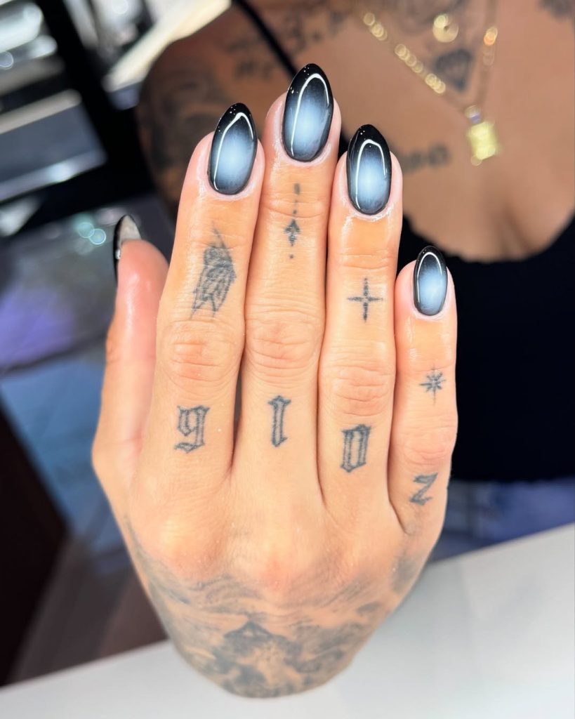 Powder-blue centers float on midnight rims, finished with tiny chrome kisses at tips and cuticles—futuristic, but still wearable. Think knit dress, biker jacket, and mirrored hardware. If you love mixed metals, switch to micro-foils with gold for warmer wardrobes.